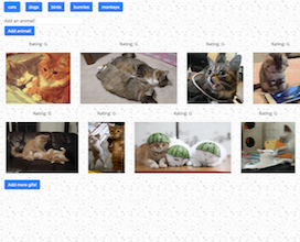 A gif generator with animal-themed gifs. Click on a button to see gifs for that animal, click on a gif to animate it.