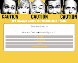 A timed quiz with 10 "Sunny In Philadelphia" trivia questions.