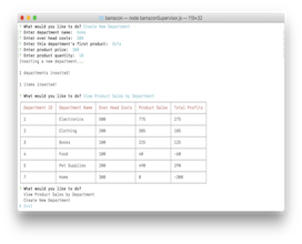 Bamazon is a CLI storefront app. There are three different views: Customer View, Manager View, and Supervisor View.